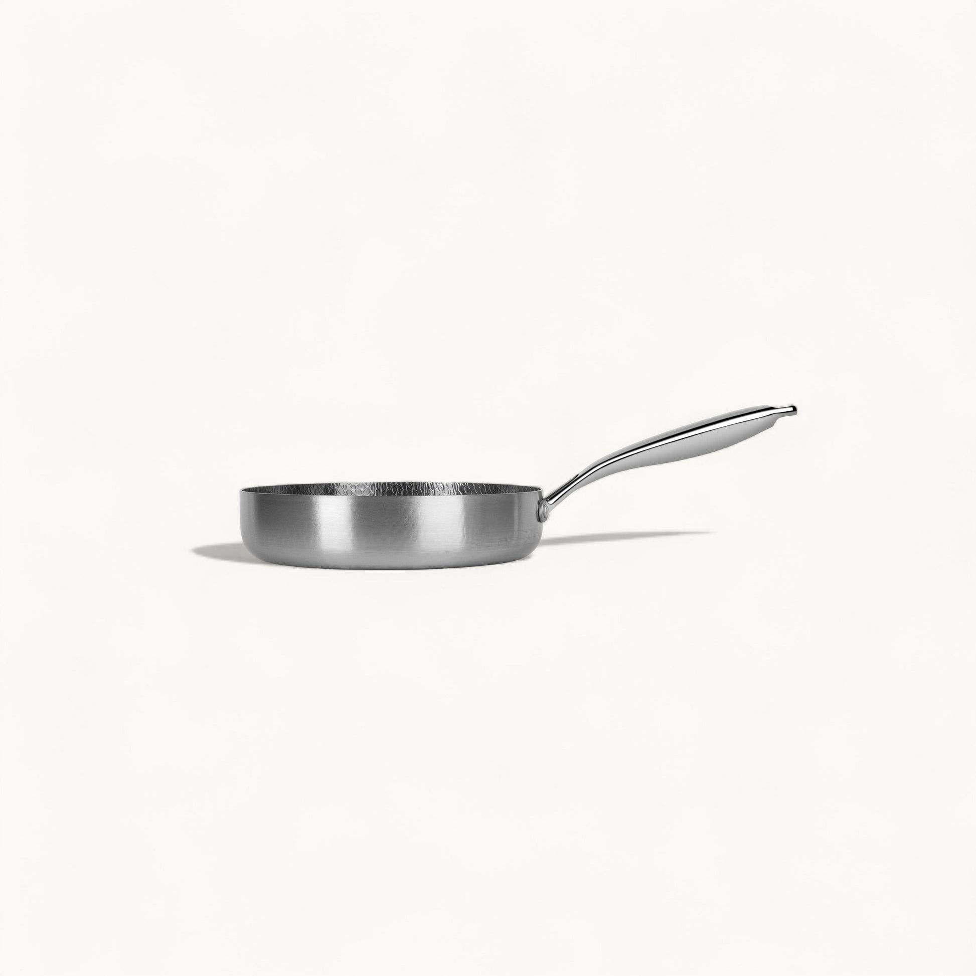 Our pans use pure grade 1 titanium, finished with a hand-hammered microtexture. This creates small natural valleys that minimize food sticking, improve air circulation, and make the pan hydrophobic over time. It's a naturally nonstick surface, free of Teflon, coatings, or chemicals.