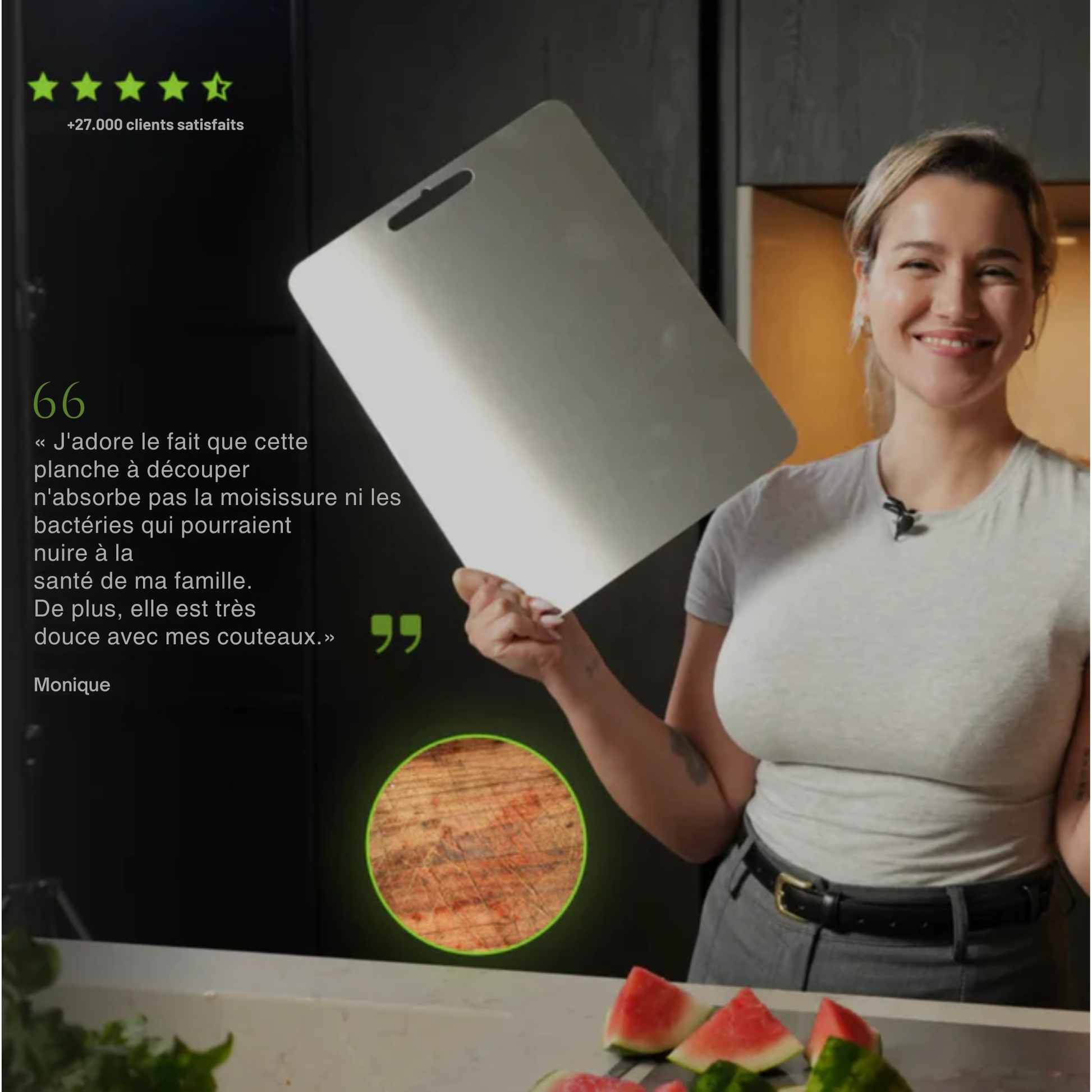 J'ai toujours essayé d'éviter les planches à découper qui abritent des bactéries ou libèrent des substances nocives. Depuis que j'utilise ma planche en titane, elle est incomparable. Elle est totalement sûre, n'absorbe ni les odeurs ni les liquides, et reste impeccable à chaque utilisation. De plus, couper dessus est une expérience différente : ferme, hygiénique et durable. J'ai l'impression d'avoir enfin trouvé la planche idéale pour ma cuisine.