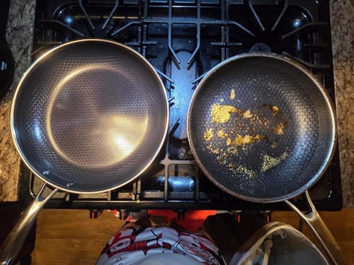 Titanium X à gauche, imitation à 70 $ à droite. J'ai fait des hamburgers avec les deux et je les ai lavés à l'eau. Tout s'est détaché avant même que je les nettoie au savon. Les meilleurs steaks que j'aie jamais cuisinés sont sortis de cette poêle. Elle cuit plus uniformément et ne nécessite pas de feu très vif. Elle a une belle grande surface et semble très bien cuite. J'ai envie de cuisiner 20 fois par jour juste pour pouvoir nettoyer ce truc stupide encore et encore ; c'est fantastique.